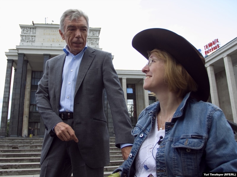Уполномоченный по правам человека в России Владимир Лукин помогает участнику акции подняться по пандусу к Российской государственной библиотеке.