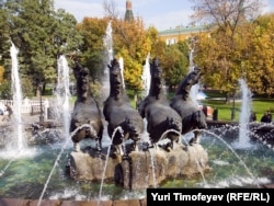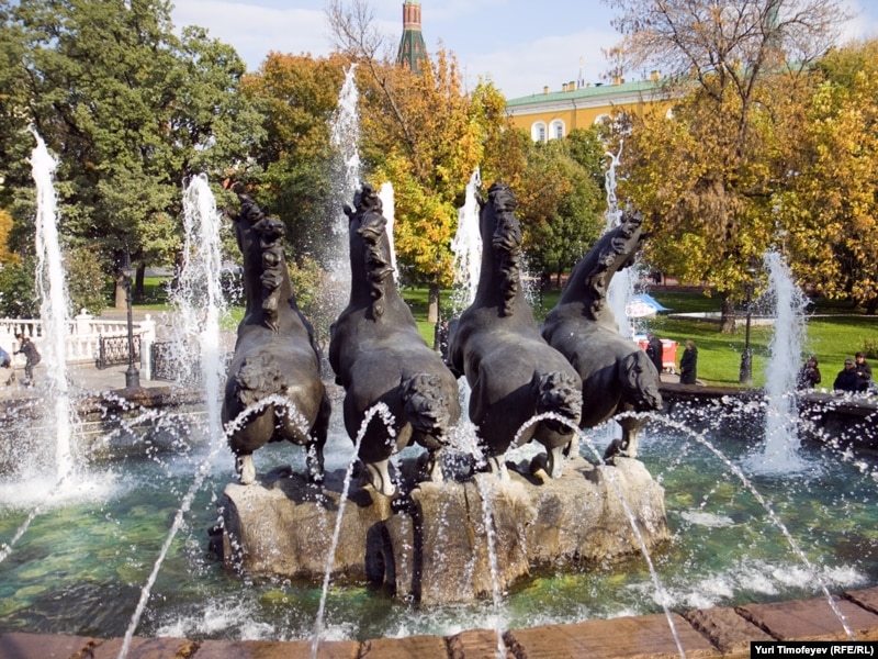 Лошади, символизирующие времена года, скачут по направлению к Кремлю. Композиция в Александровском саду