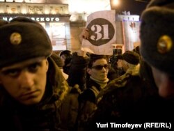 В Москве на Триумфальной площади прошла акция движения "Стратегия 31" в защиту 31-й статьи конституции, гарантирующей гражданам свободу собраний.