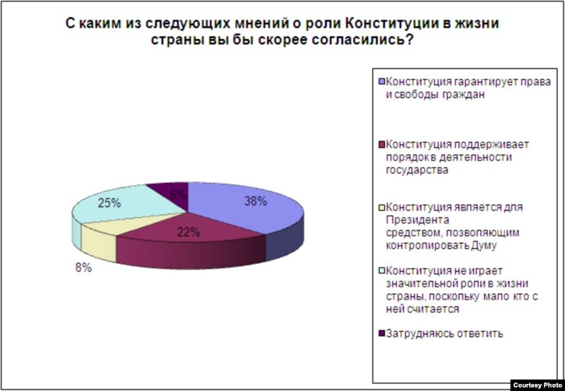 По данным Левада-центра, три четверти россиян знают, какой праздник отмечается 12 декабря. А вот по поводу роли самой Конституции в жизни страны мнения разделились. Большая часть опрошенных – 38 процентов – считают, что она гарантирует права и свободы граждан, 22 процента – что она поддерживает порядок в деятельности государства, 8 процентов уверены, что Конституция является для президента средством, позволяющим контролировать Госдуму. А каждый четвертый отмечают, что Конституция не играет важной роли в жизни страны, поскольку с ней мало кто считается.