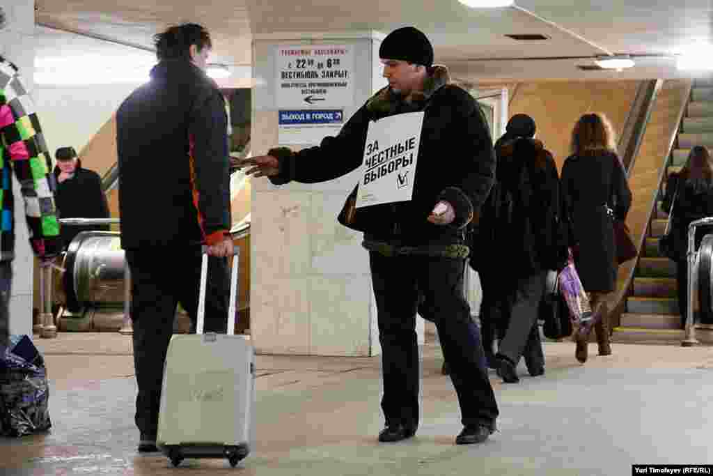 У станций московского метро проходят пикеты с призывом к гражданам прийти на шествие "За честные выборы" 4 февраля.
