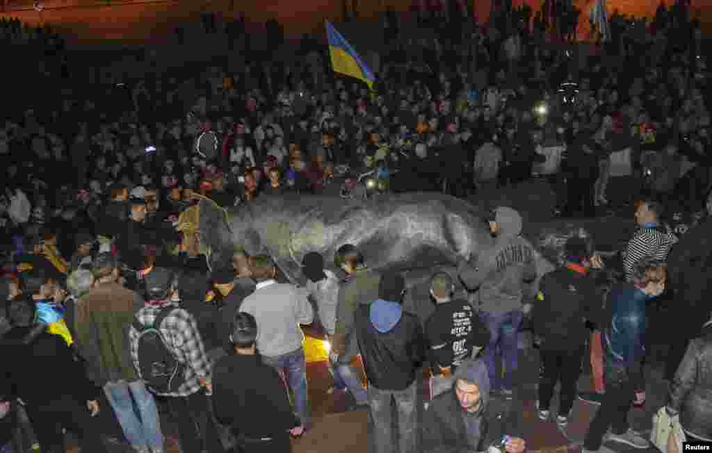 В воскресенье участники митинга "За единую Украину" в Харькове и представители радикальных украинских националистических движений снесли крупнейший на Украине памятник Ленину, стоявший на площади Свободы. По сообщению главы МВД Арсена Авакова, распоряжение о сносе памятника было подписано губернатором Харьковской области Игорем Балутой. Несмотря на это, по факту сноса было возбуждено дело о хулиганстве, закрытое менее чем через сутки. У памятника последний год проходили акции сторонников и противников территориальной целостности Украины