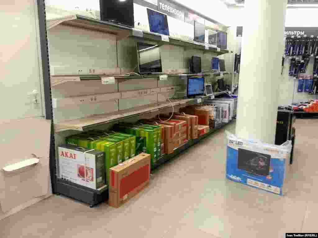 В России наблюдается ажиотажный спрос на отдельные виды товаров, в первую очередь, на бытовую технику и электронику. Отчасти такие рекордные продажи связаны с наступающим праздником, но основная причина – в желании людей вложить свои обесценивающиеся рубли перед неминуемым повышением цен. В результате этой массовой скупки товаров в некоторых магазинах Москвы, например, уже заметно их полное или частичное отсутствие. Фотографии сделаны смартфоном