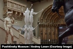 Е.Щ.: Мы работаем вместе уже достаточно давно. Началось все в 2012 году, когда делался проект для Московской международной биеннале молодого искусства. Позже сотрудничали в рамках различных проектов во Франции и других странах. Я создавала тексты для каталогов, журналов по искусству. Так что к сотрудничеству в рамках Венецианской биеннале и ГМИИ имени Пушкина мы пришли самым естественным образом. К примеру, венецианский проект отличается от других выставок Recycle потому, что это тотальная инсталляция, созданная некоей особой атмосферой, в которую попадает зритель. Для художников здесь было важно дать зрителю почувствовать собственное телесное продвижение в пространстве, ощутить разницу между телом виртуальным, которое мы начинаем осознавать и ощущать через внетелесный интернет-опыт, который мы получаем каждый день. Это – открытое произведение, где люди с самым различным персональным бэкграундом могут находить для себя разные смыслы. Мне кажется, получилось интересно, если соотносить павильон в целом с концепцией куратора Биеннале Кристин Масель, которая сказала в одном из своих интервью о том, что “искусство, наверное, не может непосредственно изменить мир, но способно порой задавать какие-то неудобные вопросы, заставляющие зрителя серьезно задуматься”. И в Русском павильоне, мне кажется, это получилось. Выставка задумывалась как своего рода опера, имеющая три части. В то же самое время Teatrum Orbis – это атлас, то есть все картины мира. У Гриши Брускина такое понятие, как “время”, перестает существовать, мы просто находимся в общем массиве информации и знания. Знание не всегда энциклопедично. Оно может быть разным, включая и альтернативные формы. Даже тело в его проекте существует как некий шаманский атрибут, своего рода артефакт. После Брускина мы спускаемся к инсталляции Recycle, который представляет из себя лабиринт, попадая в который неизбежно задаешься вопросом “что есть тело, если оно – код?”. И как можно тогда его видеть? Тут мы возвращаемся к вопросу классической скульптуры, к “идеальному телу”, “идеальному образу”, который сейчас уже генерируется машиной, и та начинает конкурировать с сознанием человека. Сегодня ведь уже даже обычный автомобиль – не просто техническое средство передвижения, но некий интеллектуальный объект. У него появляется своя мораль, в соответствии с которой он может убить пассажира или пешехода. Здесь возникает момент “переключения” – чем являемся мы и чем является интеллектуальный образ, существующий в пространстве виртуальной сети.