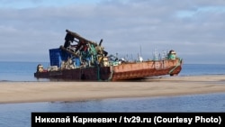 Утром 2 сентября информационное агентство "Беломорканал" опубликовало видео, снятое 31 августа рядом с двумя понтонами, оказавшимися у берега Двинского залива рядом с селом Нёнокса после взрыва на морском полигоне ВМФ. На видео показан замер радиационного фона, и его уровень рядом с понтонами существенно превышает допустимый. Сегодня Радио Свобода впервые публикует фотографии понтонов в высоком разрешении: на одном из них мы обнаружили подъемный кран, дизель-генератор, а главное – небольшой желтый контейнер для транспортировки опасных радиоактивных отходов.