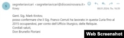 Чтобы подтвердить или развеять сомнения относительно подлинности мощей, подаренных Михаилом Даниловым московскому храму, Радио Свобода решило обратиться к первоисточнику – епархии итальянского города Новара. Мы написали электронное письмо на адрес епископального викария Дона Брунелло Флориани с вопросом о том, может ли он подтвердить, что сертификаты 2011 и 2013 годов выданы епархией Новары, приложив их фото. Помимо этого, мы спросили, числится ли в ней иподиаконом Франко Черрути. Уже через 15 минут мы получили ответ, в котором говорилось, что тот действительно служил в курии Новары, заведуя хранилищем реликвий. По словам Флориани, работа Черрути на этой должности закончилась в 2015 году – то есть за 3 года до даты, указанной на сертификате с его подписью о подлинности мощей св. Николая, подаренных владельцем "Мутабора" настоятелю подведомственного Администрации Президента РФ храма.