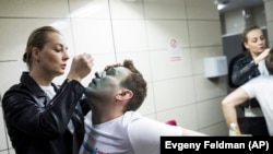 Рабочий закрашивает мурал с Навальным Фото:Olga Maltseva (AFP)