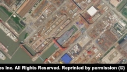 17 июня Китайская государственная судостроительная корпорация спустила на воду третий национальный авианосец, получивший название "Фуцзянь" в честь восточной провинции страны. "Фуцзянь" называют "самым большим и могучим военным кораблем, когда-либо построенным азиатской страной". На этом снимке Planet.com он запечатлен 15 июня, за два дня до спуска на воду.