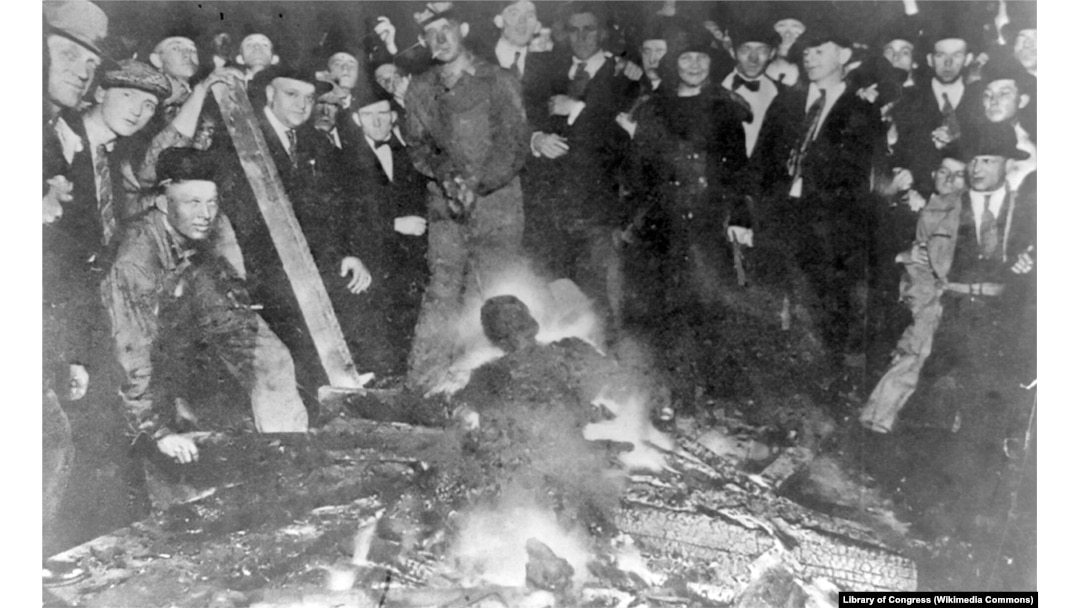 Участники казни позируют с полуобгоревшим трупом Уилла Брауна. 28 сентября 1919. Из коллекции Библиотеки Конгресса США.